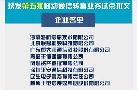 C114訊12月18日,工業(yè)和信息化部向8家民營(yíng)企業(yè)發(fā)放了第五批移動(dòng)通信轉(zhuǎn)售業(yè)務(wù)試點(diǎn)批文。 獲得第五批試點(diǎn)批文的企業(yè)有:海南海航信息技術(shù)有限公司、北京聯(lián)想調(diào)頻科技有限公司、廣東恒大和通信科技股份有限公司、青島豐信通信有限公司、鳳凰資產(chǎn)管理有限公司、深圳平安通信科技有限公司、民生電子商…