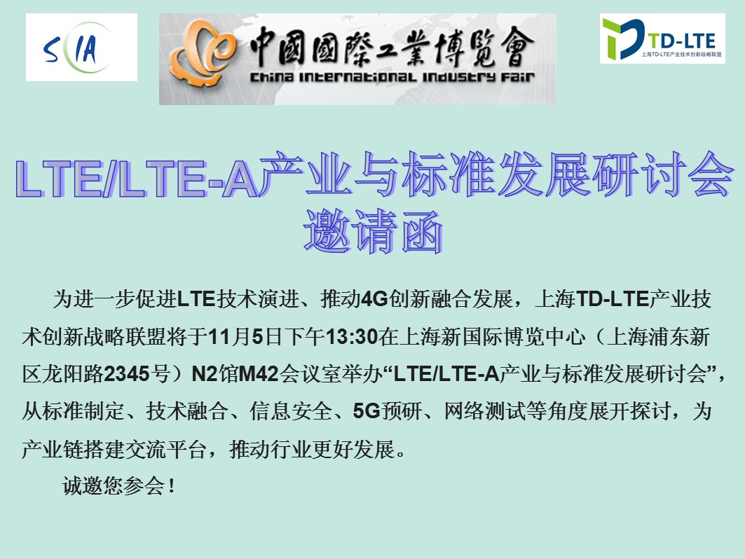 LTE/LTE-A產(chǎn)業(yè)與標準發(fā)展研討會邀請函 各相關(guān)單位: 為進一步促進LTE技術(shù)演進、推動4G創(chuàng)新融合發(fā)展,在市科委和市經(jīng)信委的指導(dǎo)下,上海TD-LTE產(chǎn)業(yè)技術(shù)創(chuàng)新戰(zhàn)略聯(lián)盟將于11月5日下午13:30在上海新國際博覽中心(浦東新區(qū)龍陽路2345號)舉辦“LTE/LTE-A產(chǎn)業(yè)與標準發(fā)展研討會”,從標準制定、技…