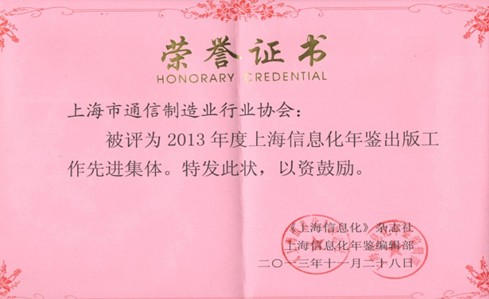 協(xié)會榮獲“2013年度上海市信息化年鑒出版工作先進集體”